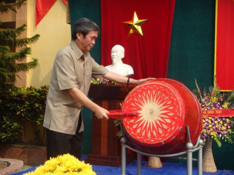 Đồng chí Đinh Thế Huynh đánh trống khai giảng năm học mới tại Trường THPT Dương Quảng Hàm.