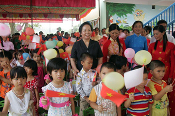 Phó Chủ tịch nước Nguyễn Thị Doan và các cô giáo, học sinh trường mầm non Chân Lý.